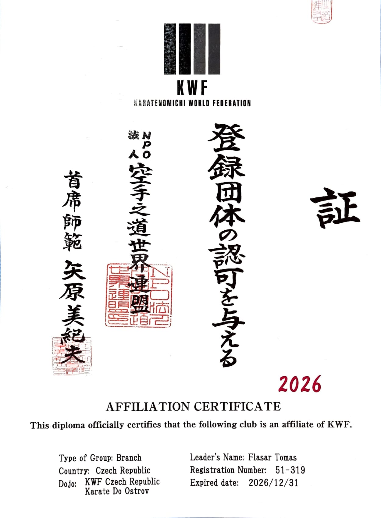 Stanovy Karate Do Ostrov, z.s.V případě zájmu požádejte o poskytnutí stanov k náhlédnutí v elektronickém formátu PDF.Certifikát člena Karatenomichi World Federation